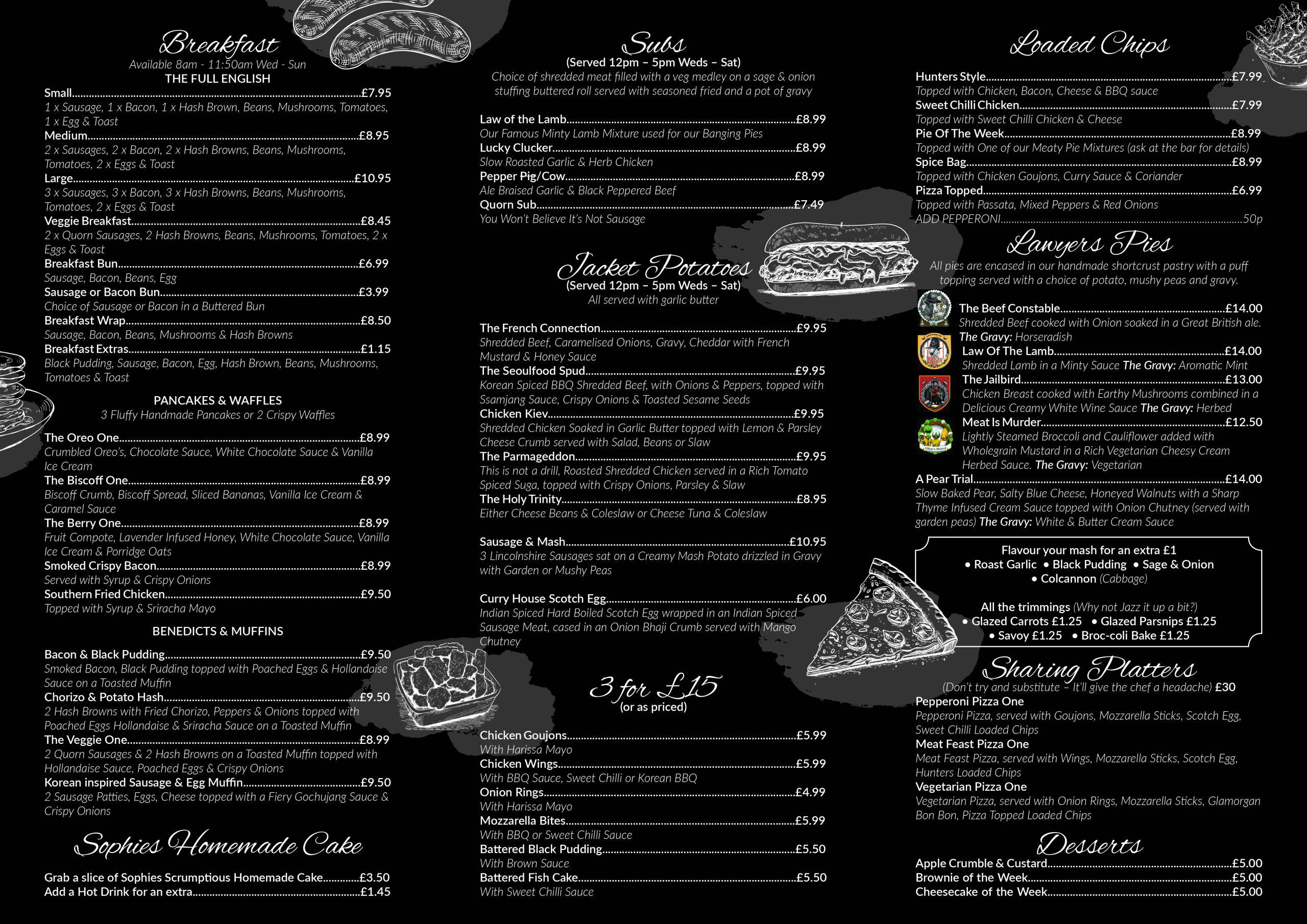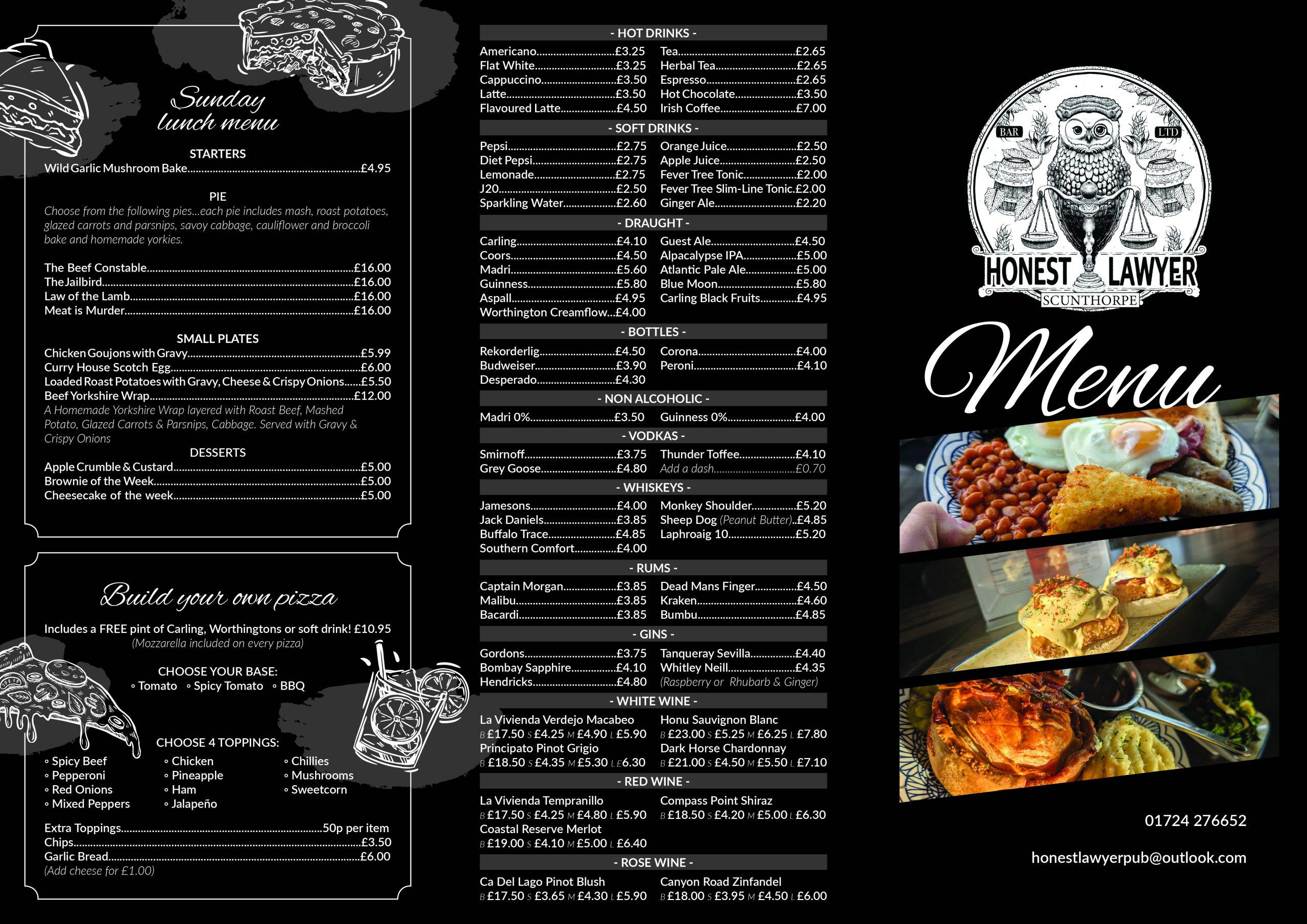 Tucked away on the outskirts of the town centre, this little base of quality is the home of Pints, Pies, Pizzas ….. And Breakfasts!!! Here at the Honest Lawyer, we promise to deliver on tasty and wholesome food, excellent service & a proper decent pint.